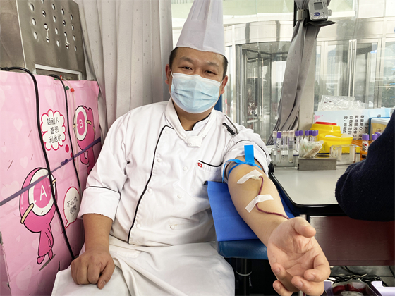 酒店厨师长段斌已经是第五次进行无偿献血了,他说,希望大家在身体条件允许的情况下,捐献热血、温暖他人。