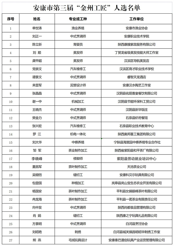 附件:安康市第三届“金州工匠”人选名单