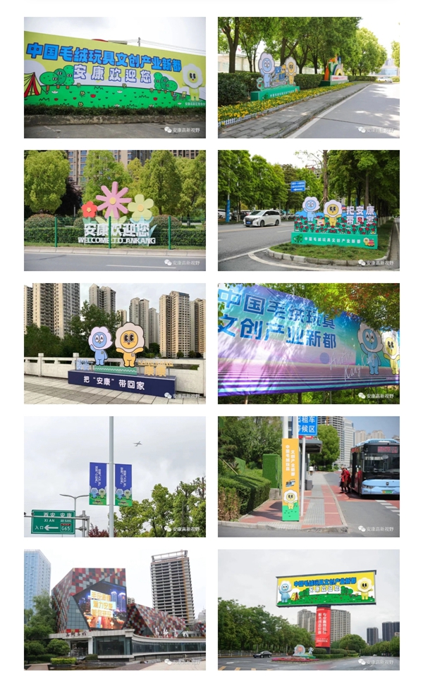 连日来,漫步在安康高新区的大街小巷,皆是造型可爱、活泼动人的“安安康康”毛绒玩具形象,一个个造型精致的景观小品,一幅幅主题鲜明的公益广告随处可见,像是“会说话”的美丽风景,将安康“中国毛绒玩具文创产业新都”的形象传递在街头巷尾,散发出浓厚的“五一”假日氛围。