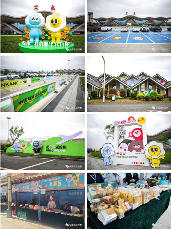 安康高新区积极推进全市毛绒玩具主题宣传氛围营造工作,配合市直相关部门将安康富强机场打造成为全国首个毛绒玩具主题机场,机场内随处可见精心布置“安安康康”形象景观小品,仿佛在向来往游客“招手”, 喜迎着八方游客。同时,组织辖区商企踊跃在汉城国际毛绒玩具主题街区参展,进一步展示高新对外形象,助推全市旅游高质量发展。