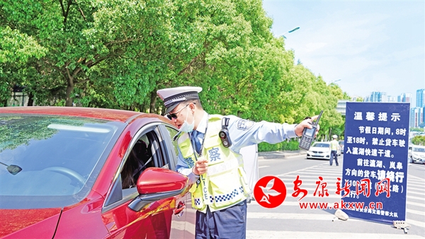 5月1日,在瀛湖快速干道与三桥北交汇路口,汉滨交警大队民警为游客介绍前往瀛湖景区情况。汪海玉 摄