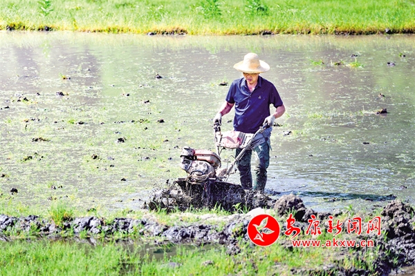 5月1日,石泉县城关镇丝银坝村百亩水田里,农户操作旋耕机做好插秧前的各项准备工作。董长松 摄