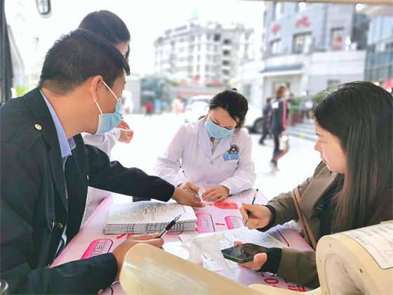 早上9点,列队等候的医务工作者们在献血车前,井然有序的进行信息登记、健康征询、血压测量等程序。他们中有多次献血的“老兵”,也有首次献血的年轻职工,有的刚下夜班,有的趁工作间隙,还有的则放弃了休息赶来。大家纷纷表示,无偿献血就是以实际行动践行广大医护人员的初心使命,为老百姓的生命健康保驾护航。
