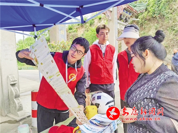 这位“帅哥”就是瀛湖镇组织人事办主任赵帅,也是瀛湖镇“五一”旅游接待保障工作志愿服务组的副组长。得知“五一”期间瀛湖景区接待压力将会激增,他主动请缨参与到旅游接待保障工作当中,从镇村干部当中优选16名干部成立志愿服务小组。为了展现志愿者良好的精神风貌,他事先组织所有志愿者进行培训,要求全体志愿者用暖心的微笑和周到的服务欢迎各方游客,做文明旅游的宣传者和推动者。在志愿服务的这些天里,他每天最早到达点位,检查服务点准备情况,确保宣传服务手册、景区游玩路线图、周边饮食住宿推荐图、矿泉水、抽纸等物资准备充分,每天下午最后一个离开,将各点位的物资进行收纳整理,同时对当日志愿服务工作进行复盘,分析存在的问题,预判可能出现的情况,确保为游客提供最贴心、最真挚的服务。