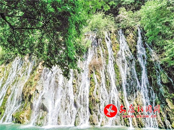 沿着木质栈道前行,没走多远,耳中就传来轰隆隆的水鸣声,循声望去,原来在大峡谷东南面的半山腰上有一挂巨大的瀑布。透过枝叶缝隙遥看瀑布的源头,只见清清的泉水翻过一条石堰,从高高的崖壁口义无反顾地纵身飞跃而下,本是浑然一体的百米巨幅水帘,被凹凸不平的壁岩、树枝、水草撕裂成形状不一的一缕缕绢绸,千丝万缕地交织着,撕扯着。细看,又犹如由万千珍珠串起的珠帘,悬于半山腰间。瀑布四周弥漫着流云般的淡淡烟霞,初夏的阳光照耀着瀑布,折射出炫目的七彩光芒,形成一道道彩虹。粒粒珍珠流光溢彩、熠熠生辉。壁岩上嶙峋的怪石被水经年累月地冲刷,早已失去了棱角,变得圆滑温润。因为潮湿的缘由,岩壁上铺了一层厚厚的、碧绿的青苔,让瀑布有了层次感,像极了妙手丹青绘制的巨幅山水壁画,鲜活灵动。游人纷纷拿出手机,在此排队拍照、摄影留念。因它位于峡谷门口,似是迎接各位游客,故得名“迎宾瀑”。想到前几日,朋友圈有人晒出闻名古今的庐山瀑布,只剩下一缕细细的溪流,从上面无力地流泻下来,似是随时都有中断的可能,哪里还有“飞流直下三千尺,疑是银河落九天”的气势时,不由得对眼前的这挂瀑布更加喜爱。
