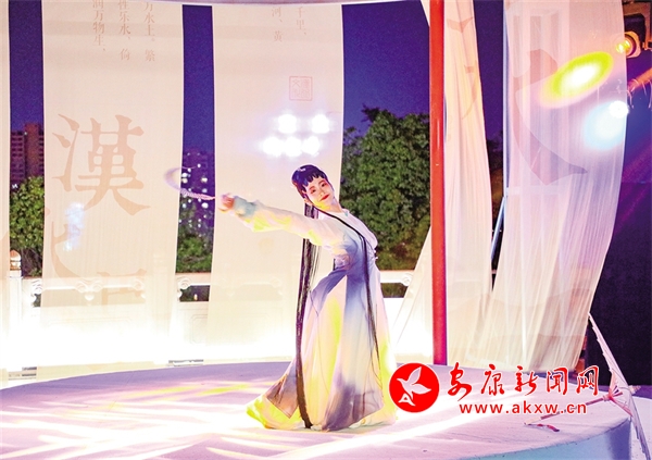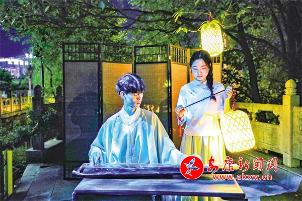 还未走近安澜楼,就被一首琵琶曲改编的丝竹乐曲《春江花月夜》吸引,流畅多变的节奏,巧妙细腻的配器,丝丝入扣的演奏,仿佛将观众带入那个月夜春江的迷人景色。环绕安澜楼四周,画家杨炳昌笔下的金州八景,仿佛一秒穿越古今,胜景徐徐、浮现脑际。