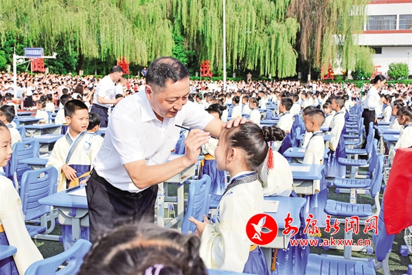 为传承中国传统文化,进一步加强学生文明礼仪教育,日前,安康高新区第一小学举行一年级新生开笔礼及优秀学生表彰活动。千名一年级蒙童身着汉服,由班主任带领跨过启蒙门,正衣冠、感恩鞠躬、朱砂启智、击鼓明志、开笔启蒙,接受中国传统文化的洗礼,领略传统文化的魅力。(张凌云 摄)