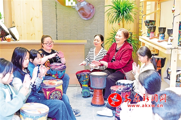 国庆期间,汉阴双河口古镇游客爆满。图为游客在古镇手鼓店体验打手鼓。陈浩 摄