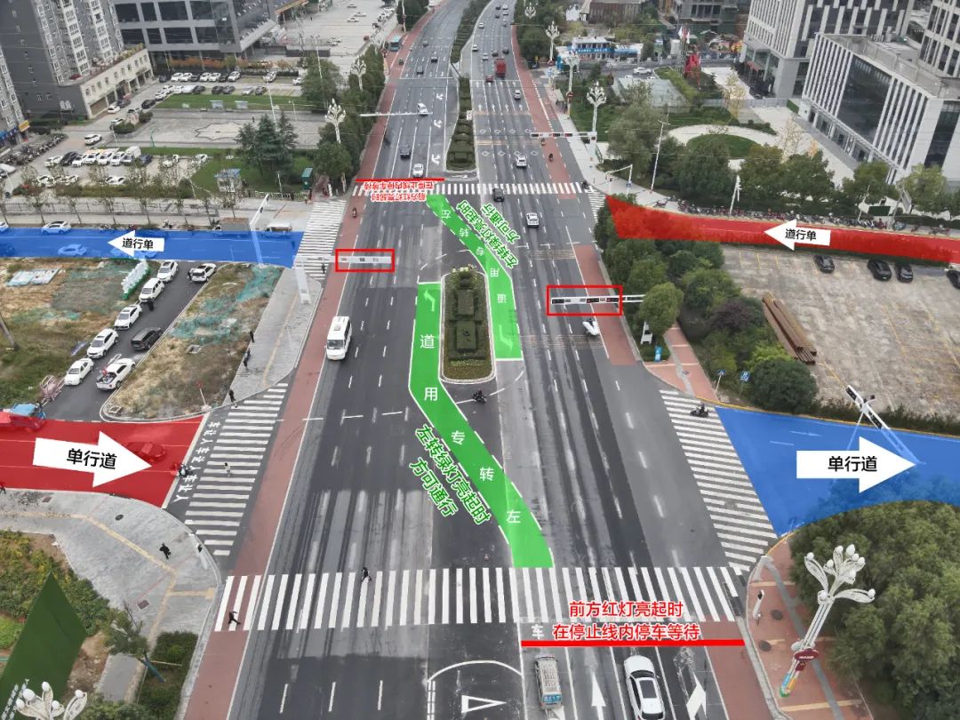 二、安康大道东西向左侧车道延伸标线(上图绿色区域)为左转专用道,并非左转等待区,在左转绿灯亮起时方可通行。