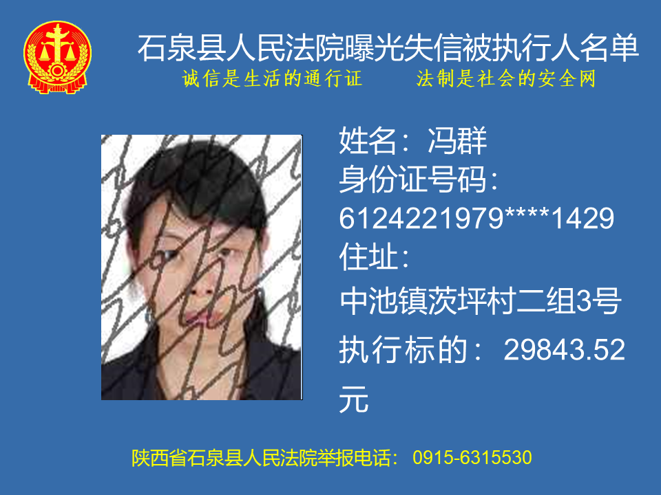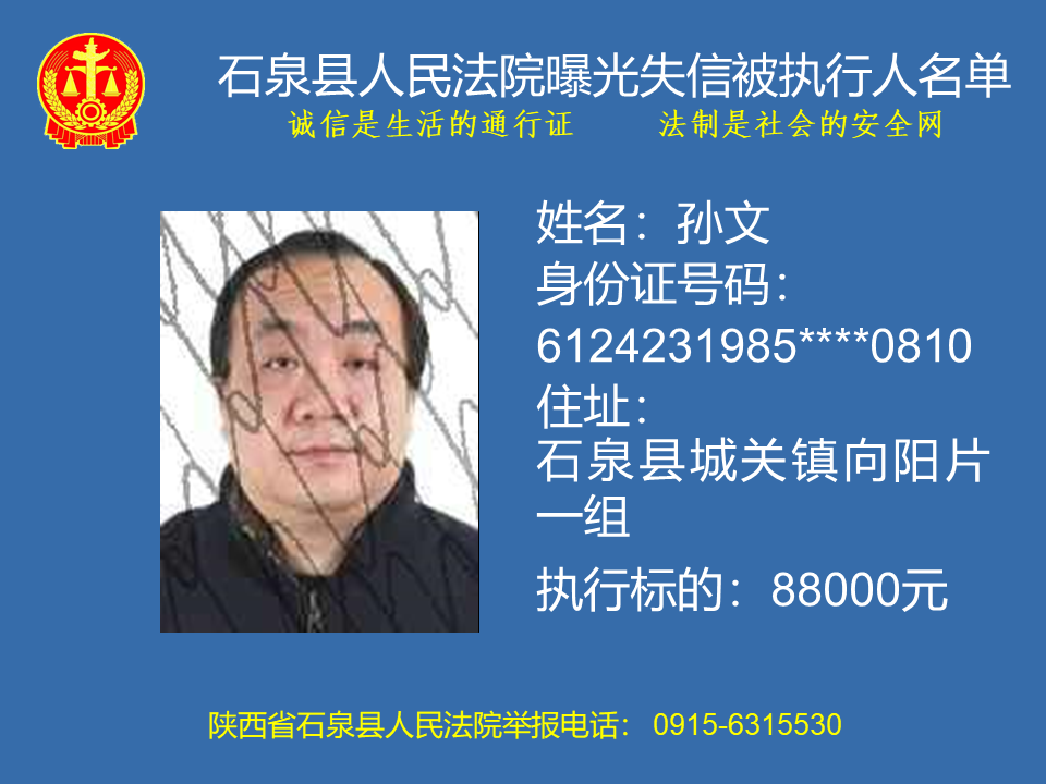 为了进一步加大执行力度,保障胜诉当事人的合法权益,推进社会诚信体系建设,依照《中华人民共和国民事诉讼法》、《最高人民法院关于公布失信被执行人名单信息的若干规定》等法律、司法解释的有关规定,现对一批已进入执行程序,且尚未全部履行义务的被执行人进行媒体曝光,欢迎广大群众支持石泉县人民法院的工作,向我院提供被执行人的财产线索,使生效法律文书能够得到切实执行,让人民群众切实感受到公平正义就在身边。