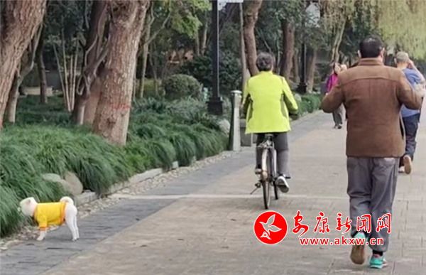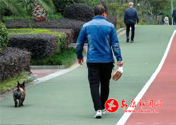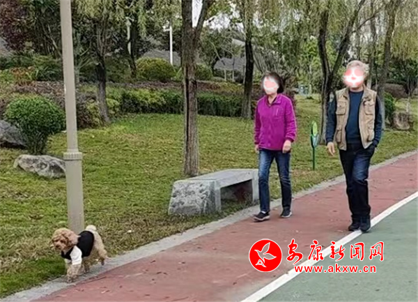 11月9日上午,汉江公园人行步道,有市民遛狗未牵绳。(图文/马欢)