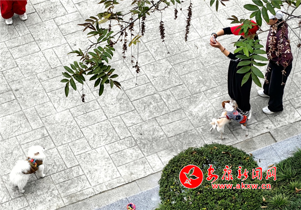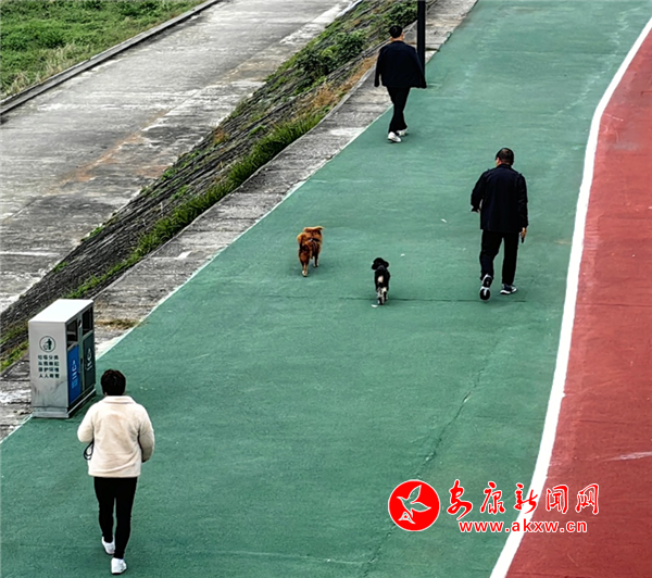 11月9日上午,汉江公园江边步道,一健身团队有队员带着宠物狗健身,却并未给狗系绳,任由狗随意跑动。(图文/马欢)