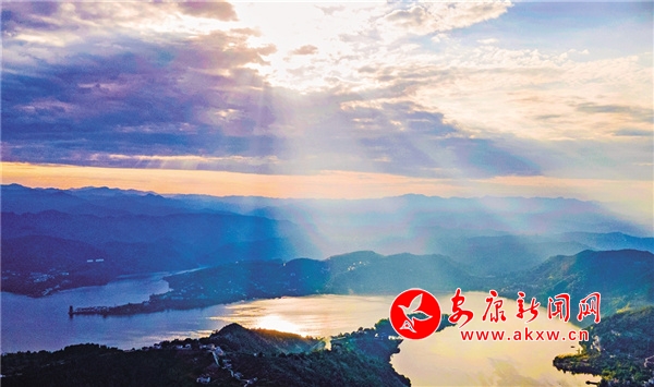 夕阳西下,阳光挥洒在瀛湖水面,美不胜收。