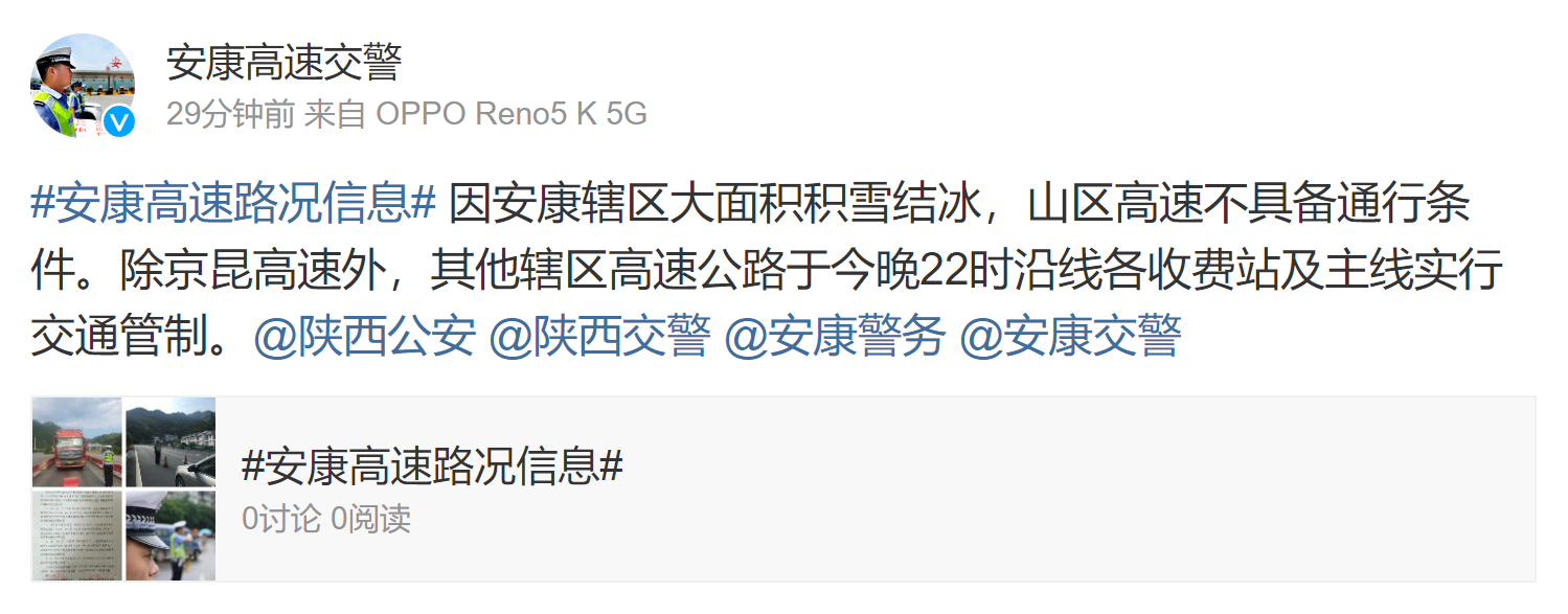 据安康高速交警消息:因安康辖区大面积积雪结冰,山区高速不具备通行条件。除京昆高速外,其他辖区高速公路于今晚(2月22日)10时沿线各收费站及主线实行交通管制。