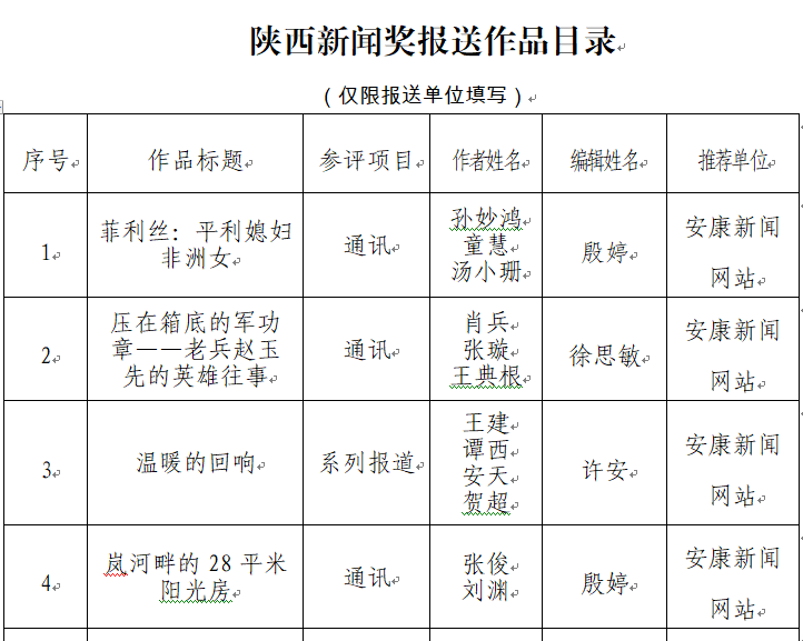经过1月30日编委会推荐、社党委研究决定,拟推荐以下4件新闻作品参评2023年度“陕西新闻奖”。公示时间从2024年3月6日至2024年3月12日,公示期为5个工作日。如有不同意见,请向安康日报社机关纪委、新闻管理部反映。