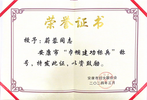 为表扬先进,树立榜样模范,在“三八”国际妇女节到来前夕,安康市妇联印发了《关于授予李少华等68人安康市三八红旗手 汉滨区融媒体中心等32个单位安康市三八红旗集体称号的决定》《关于授予成玉荣等73人安康市巾帼建功标兵汉滨区档案史志馆等38个集体安康市巾帼文明岗称号的通报》,安康市中心血站荣获“市级三八红旗集体”荣誉称号,供血科科长蔚蓉同志荣获全市“巾帼建功标兵”荣誉称号。