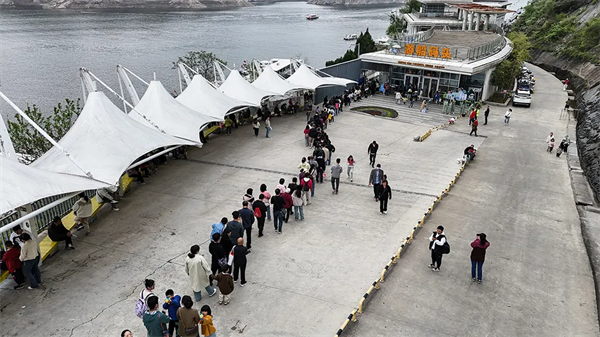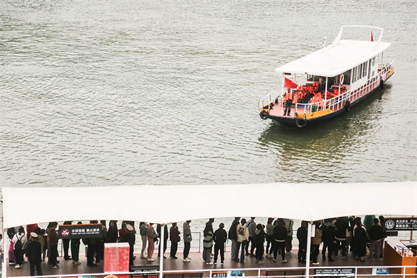 清晨7时30分,即已有游客赶到景区游客中心,8时10分,第一趟班船已然发船。上午9时,瀛湖北门口的停车场,500余停车位就已停满车辆。车辆开始向景区南大门——翠屏岛方向分流。