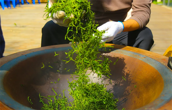 翠屏岛瀛湖茶舍,我们推出了围炉煮茶项目,炒茶师傅现场杀青、揉捻、干燥,随后将瀛湖的明前茶呈送到游客面前。当然,游客若有兴趣,也可亲自实操这难能可贵的体验。