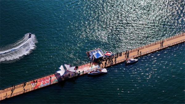游客辗转至瀛湖浮桥,水上运动中心也已乔迁至此。精彩刺激的水上项目,吸引了年轻人的极大兴趣。水上摩托艇、水上陀螺、水上拖伞。以及静态水域的水上滚筒、水上皮划艇、水上手摇船,都成了游客今年第一次亲水的最佳载体,怎一个酣畅了得。
