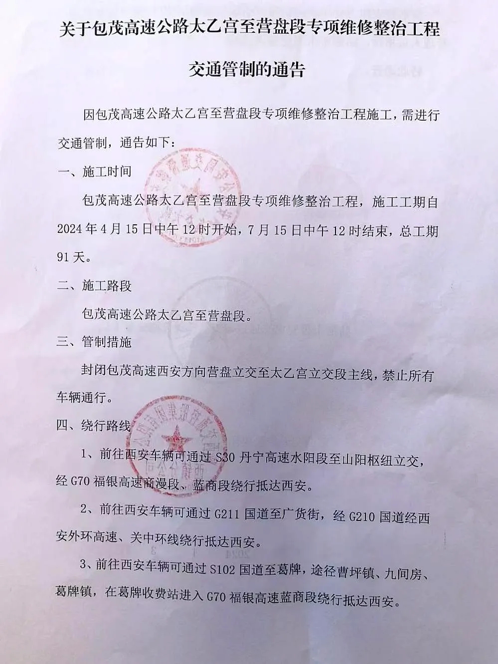 4月15日12时起,包茂高速公路太乙宫至营盘段交通管制