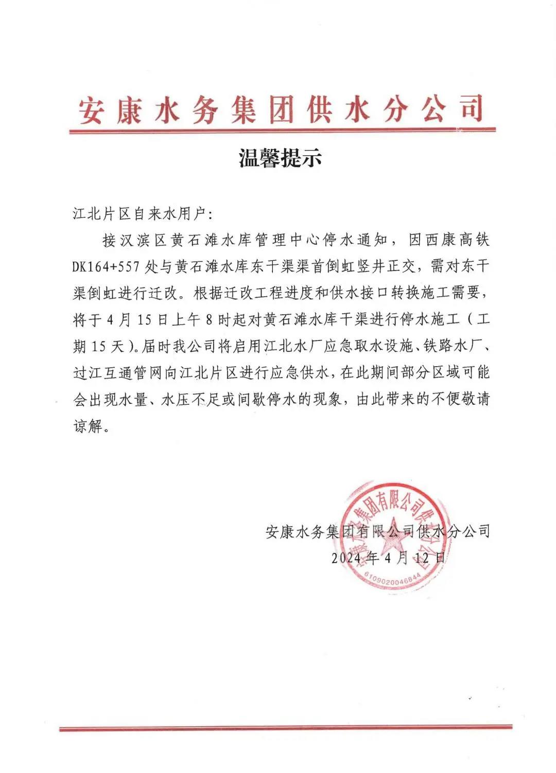 本网讯 4月12日,安康水务集团有限公司供水分公司发布停水通知:因西康高铁DK164+557处与黄石滩水库东干渠渠首倒虹竖井正交,需对东干渠倒虹进行迁改。根据迁改工程进度和供水接口转换施工需要,将于4月15日上午8时起对黄石滩水库干渠进行停水施工(工期15天)。