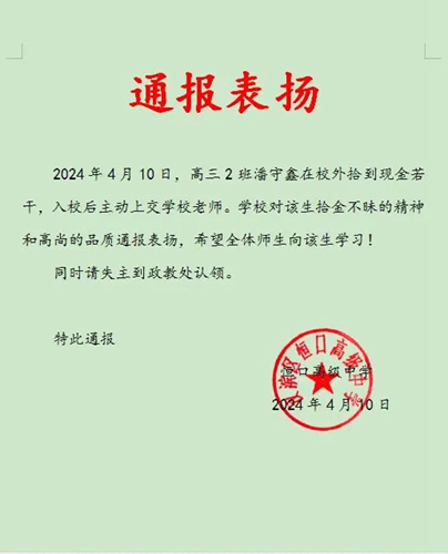2024年4月10日早晨,高三2班潘守鑫同学在校门口拾到人民币若干,在原地等了一会没有失主来找,他毫不犹豫地走进校园把钱交给政教处刘显平老师。潘守鑫同学的行为展现了恒中学子良好的社会公德和个人素养,为同学们树立了一个好榜样!