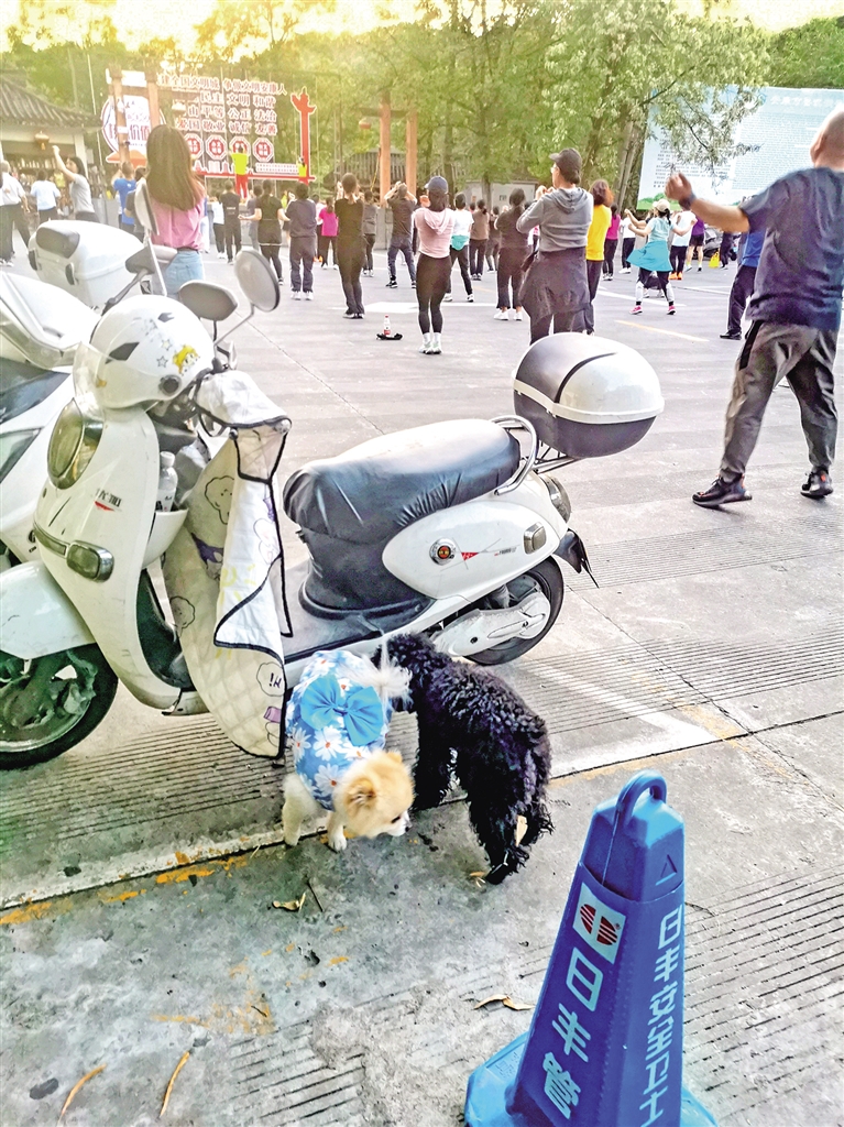 4月17日,在安康香溪洞景区广场,有市民遛狗不牵绳。