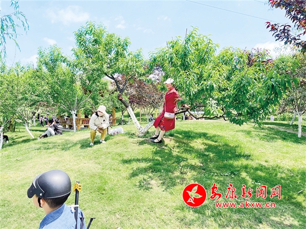 5月5日,在安康高新区桃花源景区内存在不文明旅游现象,一游客靠坐在桃花树干上拍照。胡波 摄