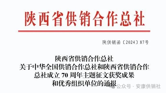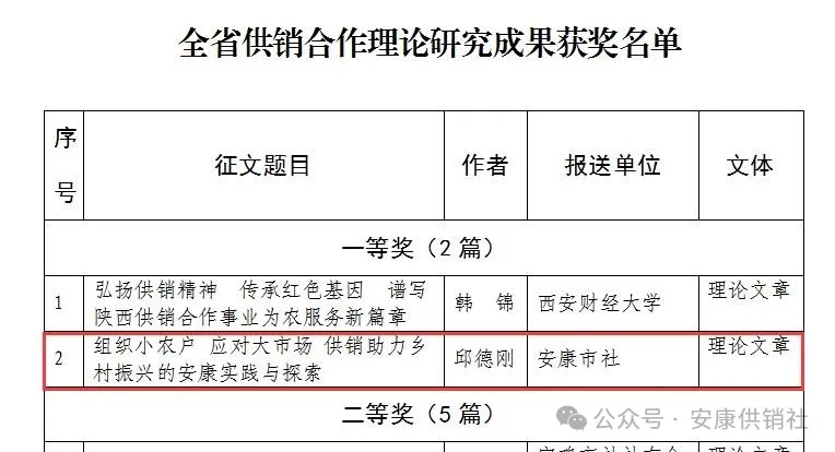 按:本文系安康市供销合作社党组书记、理事会主任邱德刚署名理论文章,立足供销助力乡村振兴的安康实践与探索,深入阐述了“组织小农户应对大市场”的内在逻辑,把群众“组织起来”投身经济合作的实践方法,在助力乡村振兴、推进共同富裕实践中探索出一条可复制可推广的典型经验,其理论内涵、实践逻辑为在推进乡村振兴中更好发挥供销社的独特优势和重要作用提供了有益参考,具有较强的指导意义。该文在中华全国供销总社和陕西省供销总社“薪火相传七十载,砥砺奋进新时代”主题征文中获评“全省供销合作理论研究成果一等奖”。