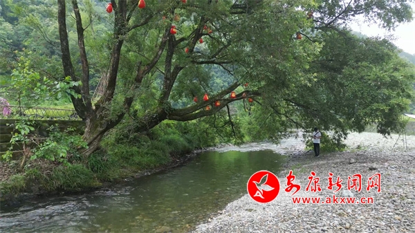菜园紧挨着一条河。河边,几棵高大的麻柳树成了几个天然的遮阳棚。河滩上则搭建了凉棚,供更多游客休憩。