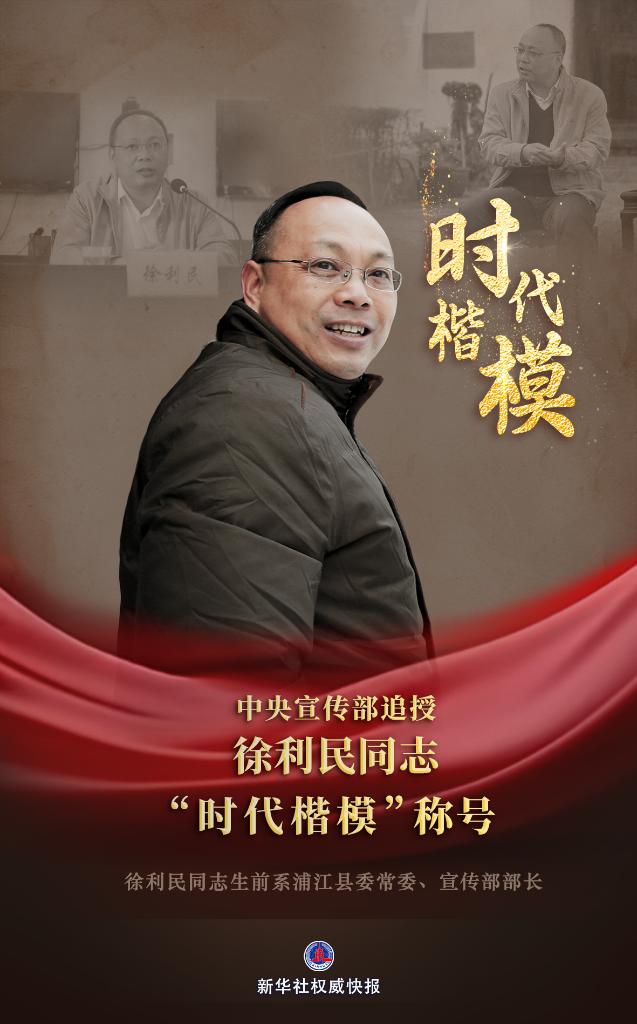 徐利民,男,汉族,中共党员,1970年6月生,浙江浦江人,生前系浦江县委常委、宣传部部长。徐利民同志扎根基层工作30余年,始终坚守共产党人理想信念,胸怀“国之大者”,献身党的事业,用一生奉献践行对党忠诚的无悔誓言。他牢记总书记殷殷嘱托,坚定不移践行“八八战略”,用为民造福彰显人民至上的价值追求。他坚持守正创新,练就过硬本领,全身心投入上山文化研究宣传,用实干笃行担当宣传干部新的文化使命。2022年9月,徐利民同志因积劳成疾,突发重病不幸去世,终年52岁。