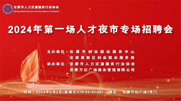为有效保障企业用工需求,促进未就业高校毕业生、退役军人、城镇失业人员、返乡农民工等各类人员就业,安康市创业就业服务中心、安康高新区创业就业服务局定于2024年8月2日(星期五)在安康高新区万达广场1号门举办2024年第一场人才夜市专场招聘会,现将活动事项公告如下:
