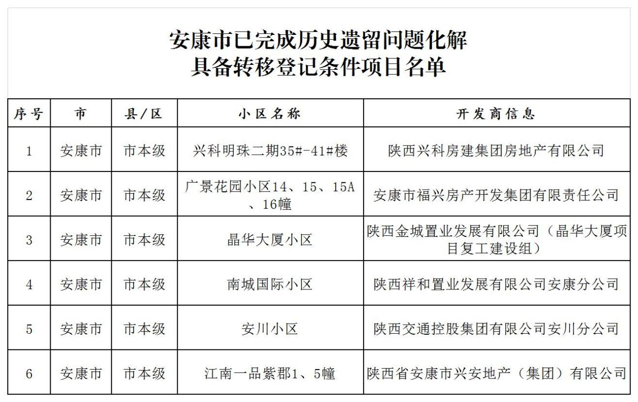 安康市市本级已完成住房领域不动产“办证难”问题化解具备转移登记条件项目名单的公告