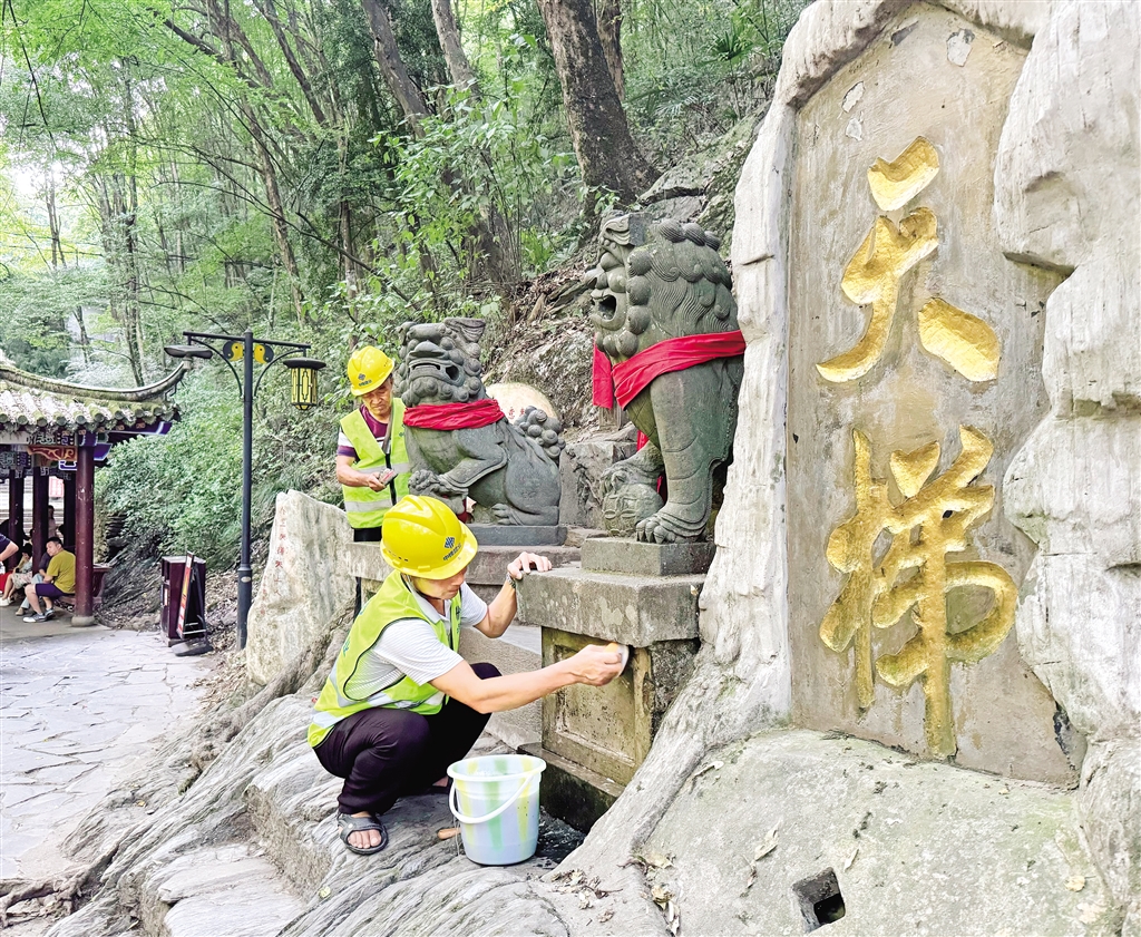 8月22日,工作人员正在香溪洞开展景区设施清理工作。据施工现场负责人介绍,香溪洞风景名胜区管理局将会对供水、供电、照明等设施进行升级改造。(邹一铭 摄)