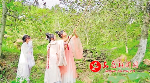 日前,汉阴县双河口镇举办“核”你有约 “桃”离喧嚣核桃采摘体验活动。吸引了众多游客前来参与,共同体验了一场穿越时空的文化之旅。据了解,该镇除了核桃采摘体验,还精心策划了古道徒步穿越、开展汉服游园,让游客们沉浸式体验古镇的古韵古风。(通讯员 贺珍珍 摄)