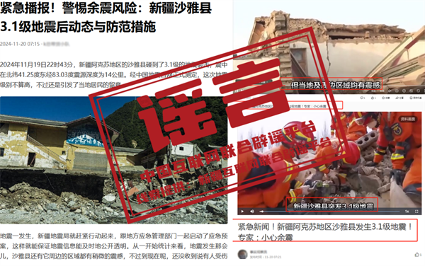 详情:11月19日,新疆阿克苏地区沙雅县发生3.1级地震,震中位于农田区域,距离沙雅县城21.2公里。经初步排查,沙雅县城区无震感,城区通讯、供电、交通道路状况正常,暂未接到人员伤亡和财产损失情况报告。但有部分自媒体账号在网络上发布一些地震废墟或灾后救援等图片和信息。对此,当地网信部门发布辟谣声明称,网传废墟和救援图片并非真实的地震现场,系某些自媒体账号罔顾事实和真相,为博取流量、吸引眼球编造发布,混淆视听误导网民。网信、公安部门郑重提醒,对编造散布地震谣言扰乱公共秩序、造成恶劣社会影响的行为,公安机关将依法依规严肃查处。(来源:“新疆网络辟谣”微信公众号、阿克苏网络举报)
