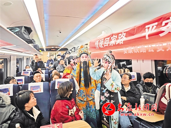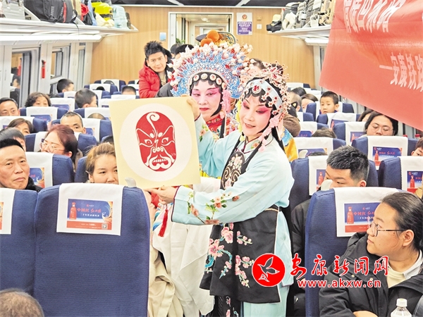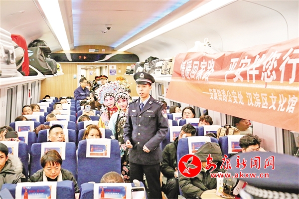 火车穿越秦巴山水间,途中,来自安康汉调二黄研究院的专业演员和地方民间汉调二黄爱好者们一同表演了国家级非物质文化遗产——汉调二黄经典戏曲演唱,并为旅客们讲解汉调二黄戏曲知识,与旅客们开展互动交流,让旅客亲身体验汉调二黄戏服道具,感受汉调二黄的独特艺术魅力。来自汉滨区文化馆的汉滨剪纸技艺传承人为旅客们展示讲解了安康市级非物质文化遗产——汉滨剪纸技艺,向参与互动的旅客送上了亲手创作的汉滨剪纸作品,提前送上新春祝福。活动中,西安铁路公安局安康公安处的民警们和文艺工作者们一同宣传普及了反诈知识,进一步提升旅客的安全防范意识。