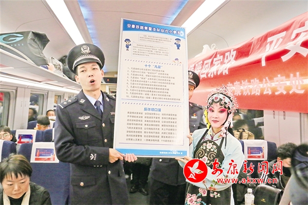 1月14日,由西安开往达州的D173次列车上,西安铁路公安局安康公安处联合汉滨区文化馆、安康汉调二黄研究院的文艺工作者,以地方非物质文化遗产技艺展示等方式,结合春运开展反诈知识宣讲,让旅客们在春运旅途中感受安康地方传统文化独特魅力,提升安全意识。
