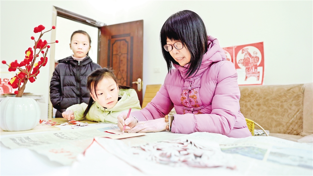 冯增慧教两个孙女学剪纸 罗妍 摄