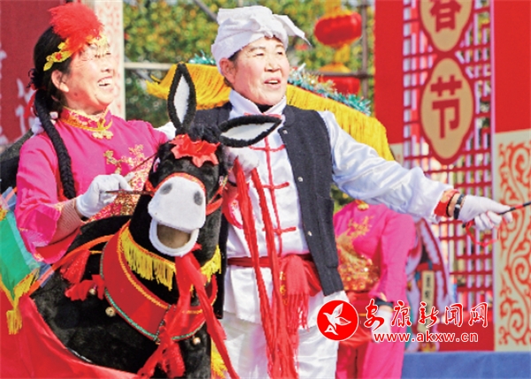 2月10日,民间艺人在金州广场表演社火《毛驴迎新春》。赵华斌 摄