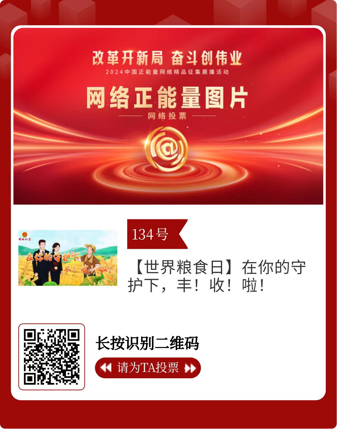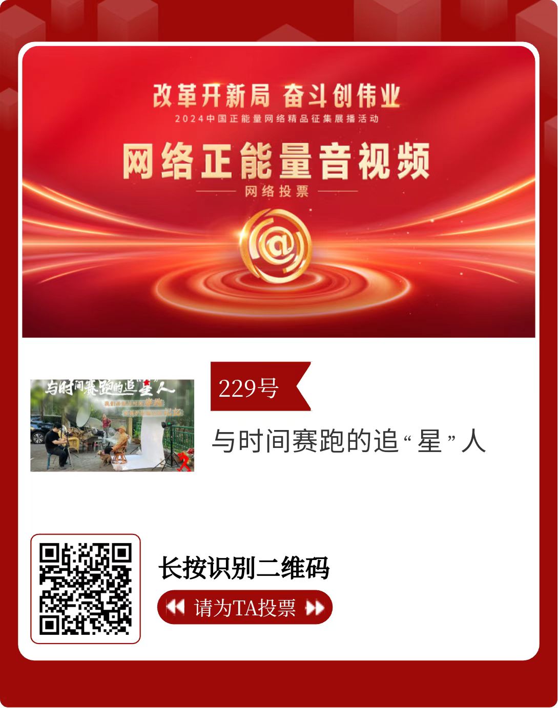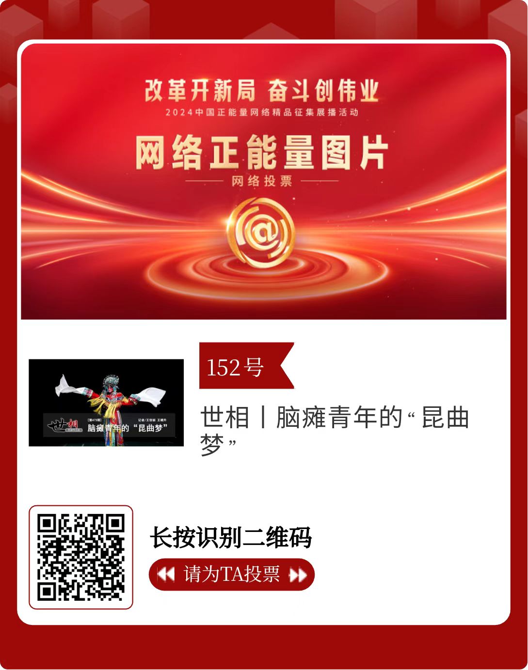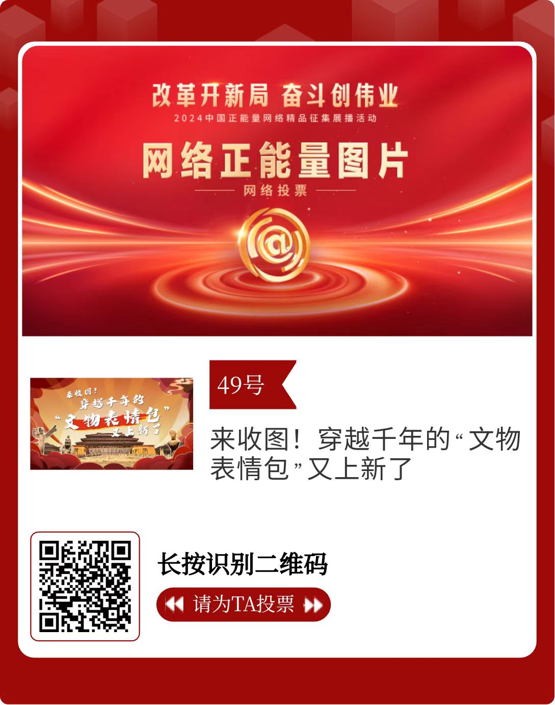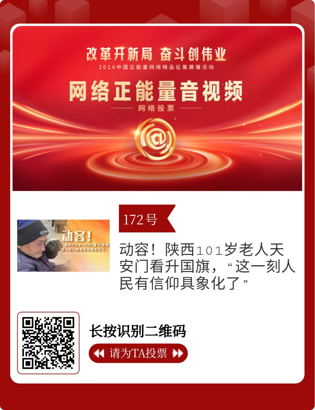 改革开新局,奋斗创伟业。由中央网信办主办的2024中国正能量网络精品征集展播活动今天启动网络展播投票。