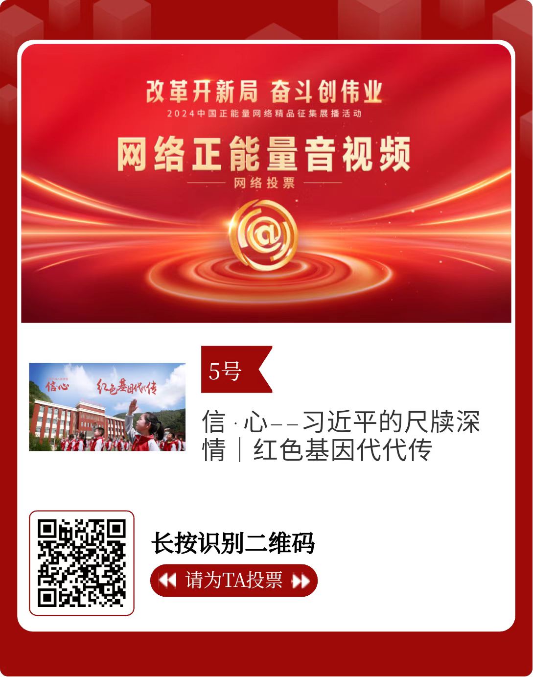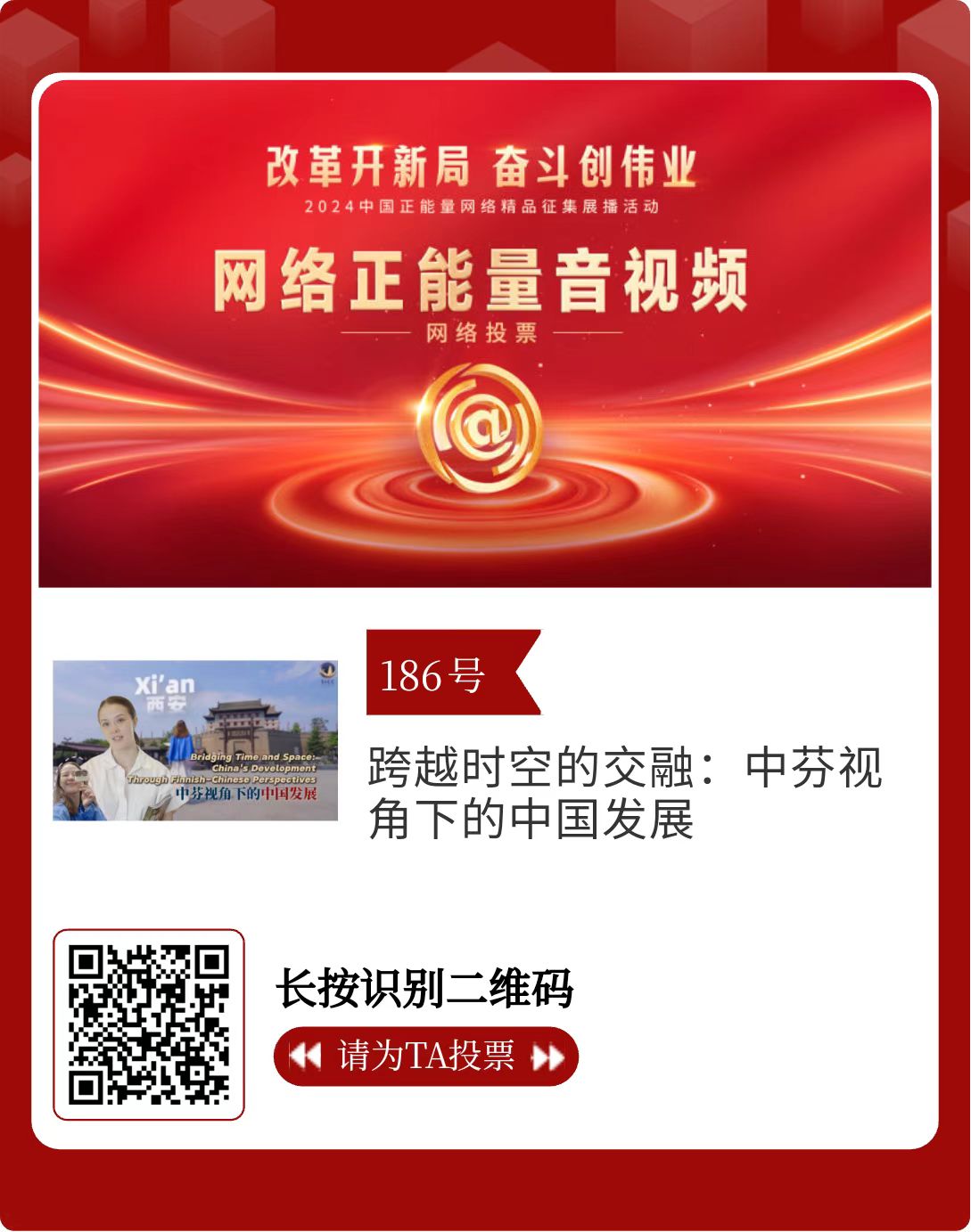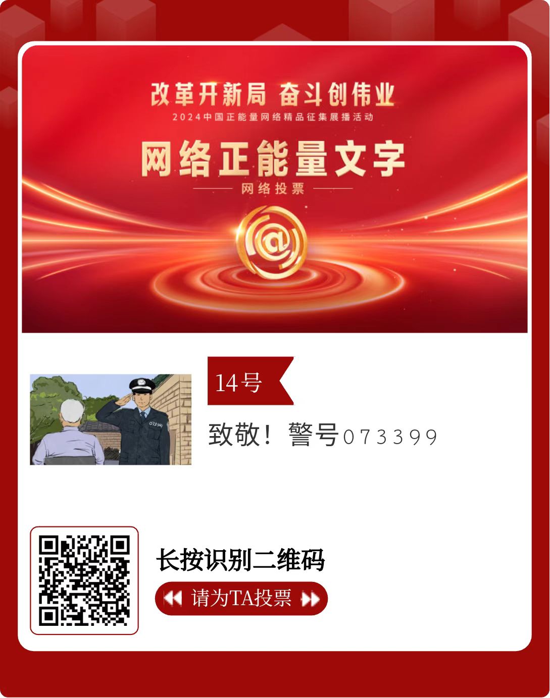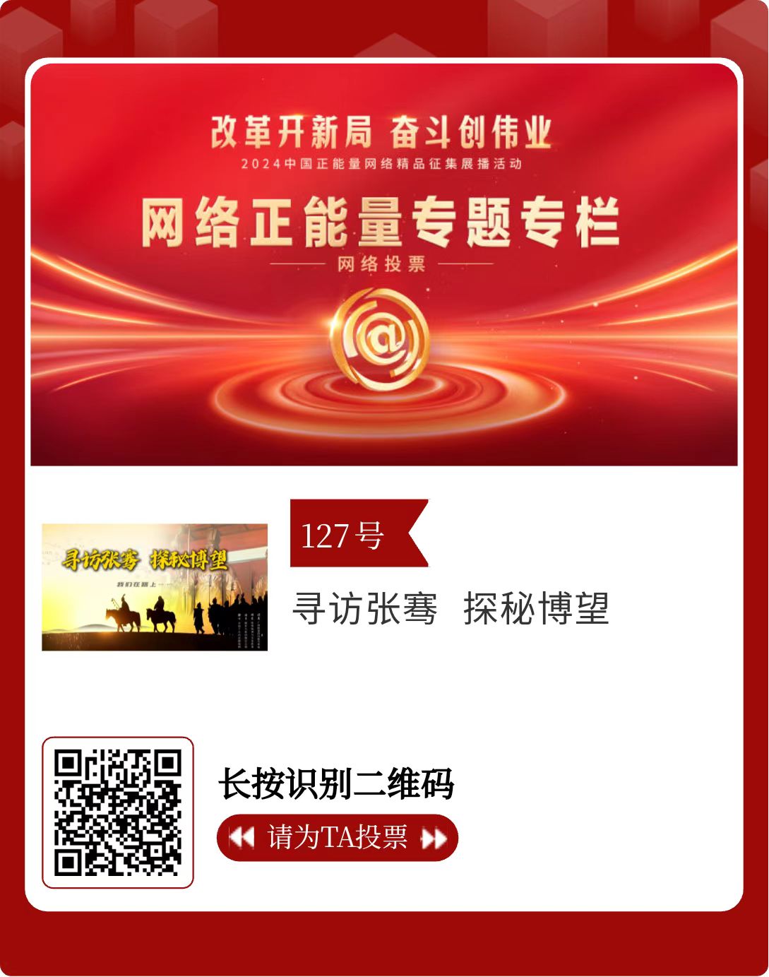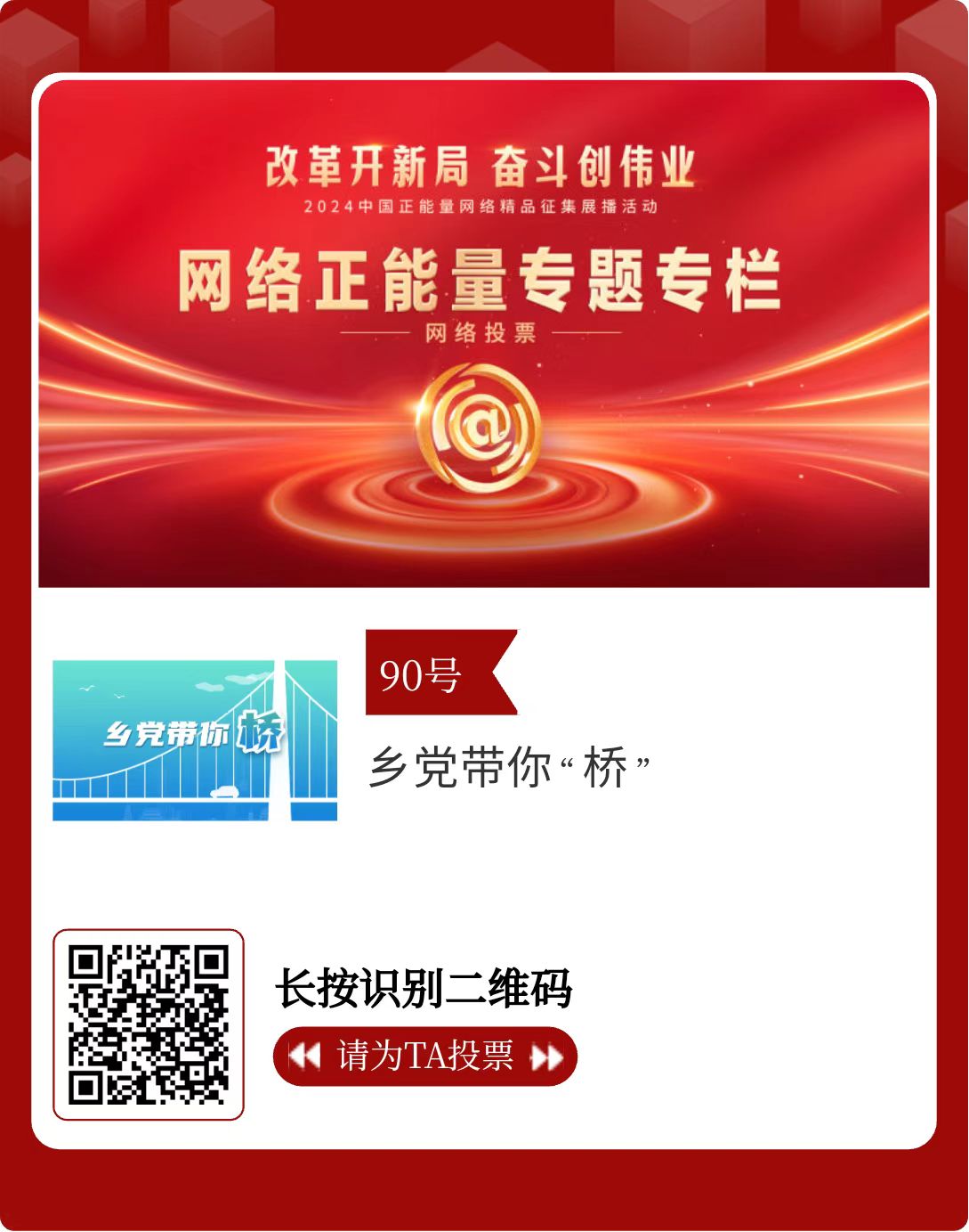 改革开新局,奋斗创伟业。由中央网信办主办的2024中国正能量网络精品征集展播活动今天启动网络展播投票。