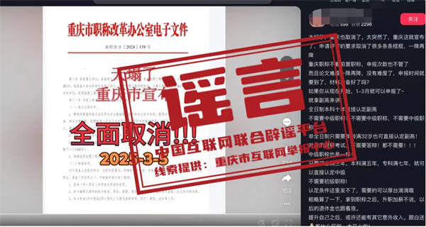 真相:近日,有网民在互联网平台发布消息称“重庆市宣布,申请评审的要求取消了很多条条框框,职称申请不看前置职称,全日制本科十年直接认定副高,不需要中级职称”,引发关注。经核实,网传信息系谣言。职称评审均需逐级晋升,取得上一级职称并满足相应学历资历条件后方可晋升高一级职称。目前重庆市除特殊人才、博士后等3个针对特定对象的职称申报绿色通道外,正常申报通道均需逐级晋升。网传文件是网民通过P图软件编辑而成,试图吸引不明真相的群众咨询,借机推销职称代办服务,收取高额费用。目前,谣言线索已转交公安机关进一步调查处置。(来源:“重庆辟谣”微信公众号)