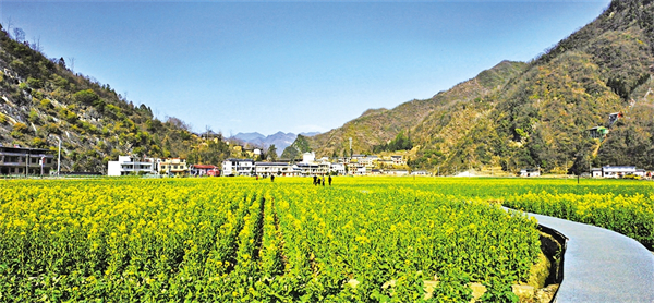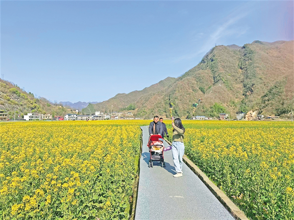 春暖花开,旬阳市仁河口镇水泉坪千亩油菜花海竞相绽放,慕名而来的游客们在观光步道上观光散步,三五伙伴一起拍照打卡、合唱民歌,欣赏高山出平川的独特自然风光。