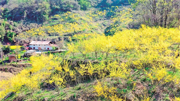 “目前,山上这一片连翘有600余亩,现在正值盛花期,除草工作刻不容缓。”园区管护负责人阚永军指着漫山遍野的连翘花介绍。