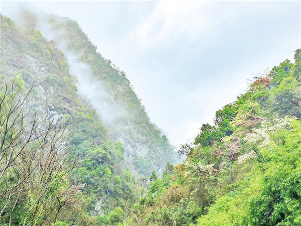 谢坪的茶园已经开园,走进郁郁葱葱的茶田,露水在新抽的芽尖上凝成珠串,鲜翠欲滴。勤劳的采茶人趁着雨停正在采茶,手指翻飞间竹篓里的鲜叶便堆得冒尖,溢出淡淡的茶叶清香。抬头看去,半山腰的野樱花也从岩缝里斜斜地探出来,粉白的花瓣在淡淡云雾的映衬下显得更加鲜艳,偶有一道阳光穿透云层,将樱花染成半透明的绯色,整座山坡便成了流动的云霞。