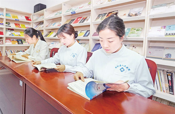 4月23日,白河县人民医院护士利用工作间隙在图书角专注阅读。(伍渭康 摄)