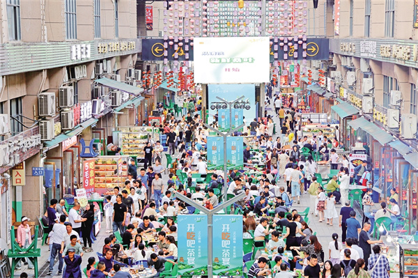 “五一”期间,紫阳县紫邑新城美食街区开展了特色文旅活动,吸引游客纷至沓来。 郑晓虎 摄
