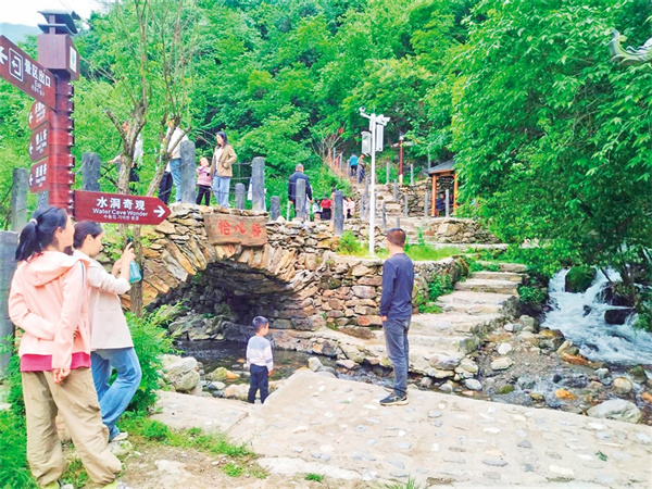 2020年以来,双河镇党委、政府以市场化改革破题,号召在外创业能人陈守林等人回乡协助开发水洞沟。“要让资源变资产,首先得打通‘任督二脉’。”陈守林介绍说:“双河镇政府累计投入资金800余万元,治理景区河道6公里、铺设石板步道4.5公里、搭建石拱桥6座,新建多处公厕,并完善停车场、旅游标识系统等配套基础设施。”这一系列举措让“养在深闺”的水洞沟景区,蜕变为可进入、可游览、可消费的旅游目的地。