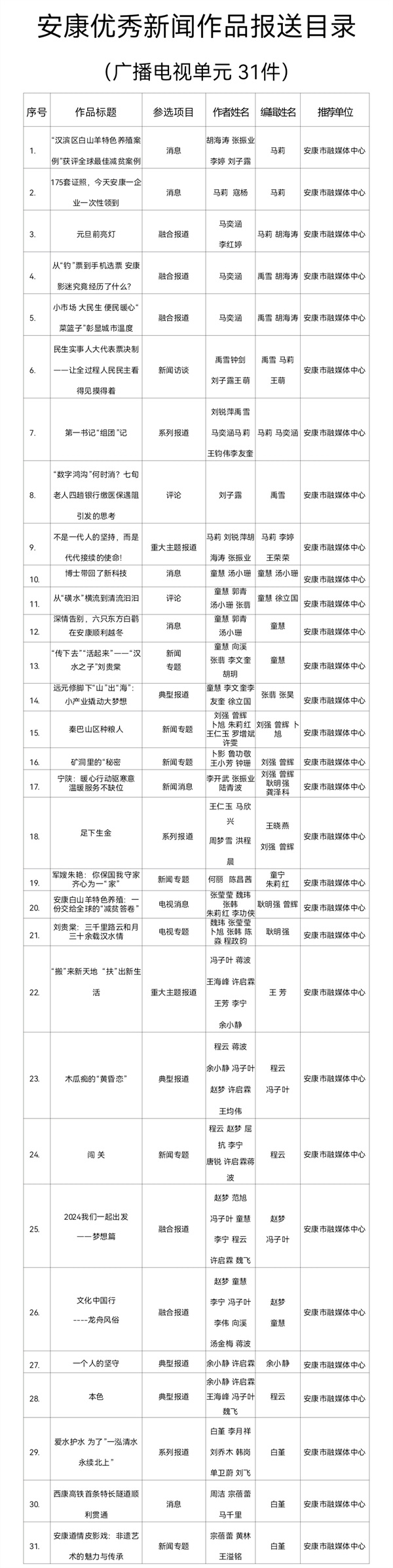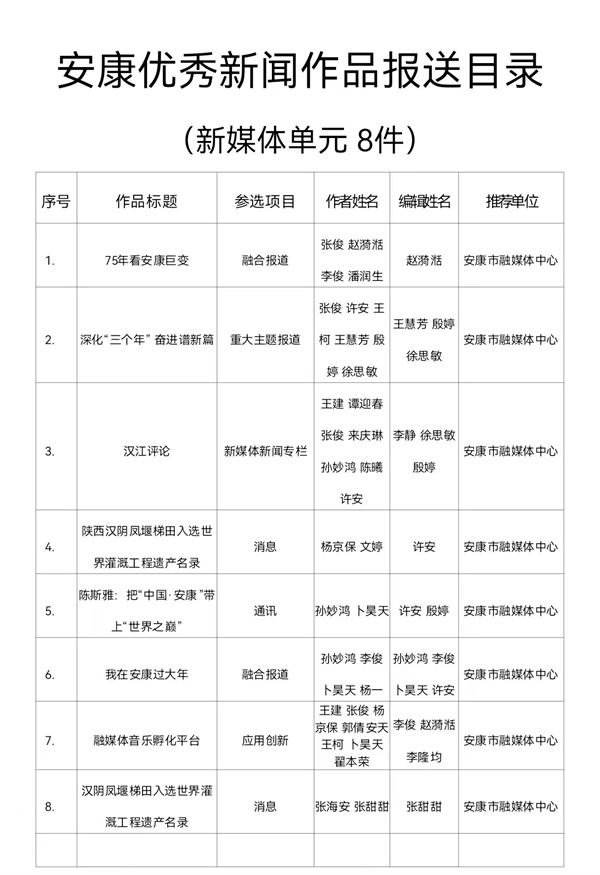 根据《关于开展2024年度安康优秀新闻作品、安康市优秀新闻工作者推选工作的通知》(安记协〔2025〕04号)文件要求,经推荐、领导审核,安康市融媒体中心推荐参评2024年度安康优秀新闻作品97件(报纸单元58件,广播电视单元31件,新媒体单元8件)。现将报送作品目录(详见附件)予以公示。